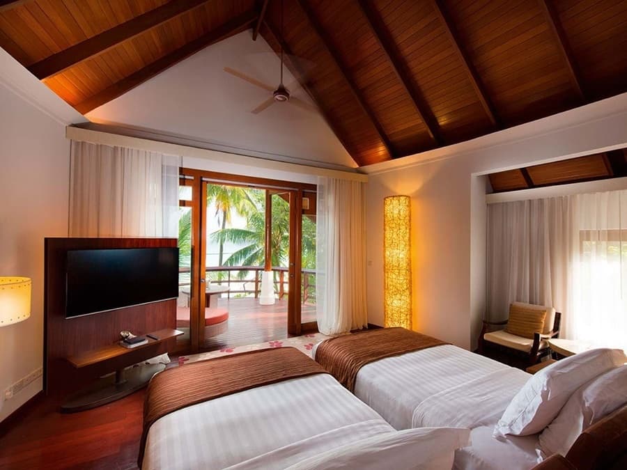 Constance Halaveli, which floats in the North Ari Atoll and is shaped like a curved Dhoni (Maldivian boat), is a magical place where water and sand contrast with the lush green foliage.